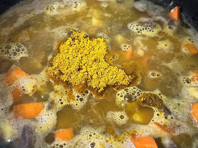 카레가루 1봉을 넣고 잘 저어 주세요. 이때 찬물 대신 끓는 물을 넣고 카레가루 넣으면 가루가 더 잘 풀어집니다.