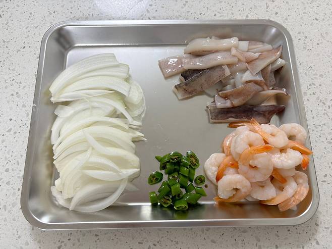 해산물(오징어, 새우, 홍합)은 깨끗이 손질하고, 양파와 고추는 썰어 준비합니다.
