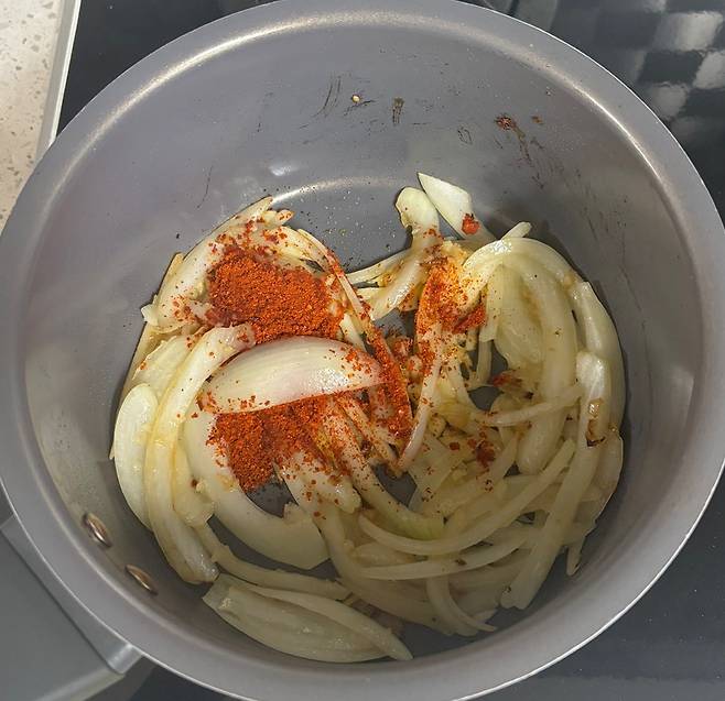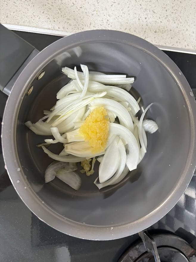팬에 올리브유를 두르고, 다진 마늘과 채 썬 양파를 넣고 노릇하게 볶습니다.