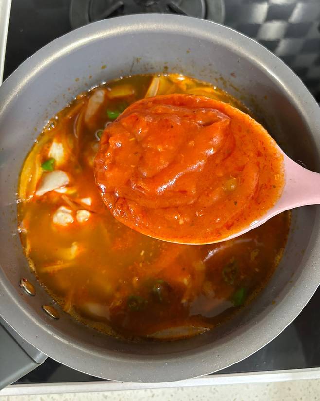 그리고 고추장 1큰술, 토마토 소스(시판용 토마토소스도 가능) 3큰술을 넣습니다.