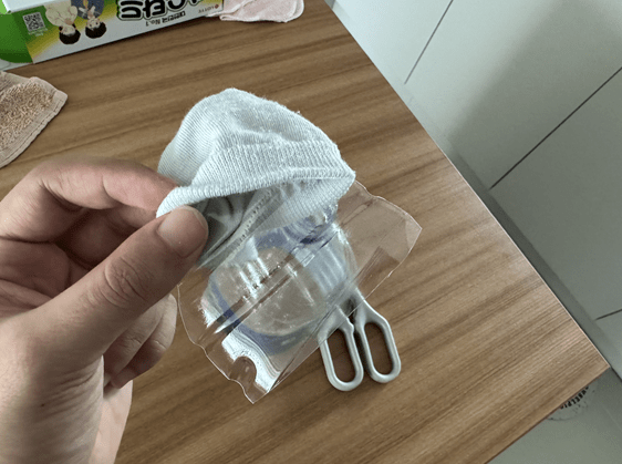 낡은 양말이나 헝겊을 뾰족한 부분에 씌워줍니다. 양말이 없다면 극세사 천도 활용 가능합니다.