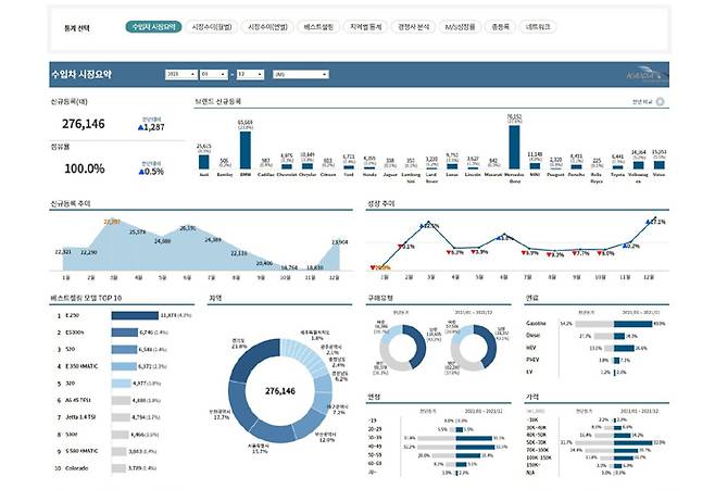 이 서비스는 프리미엄 자료회원으로 별도 가입 후 이용이 가능하며, 웹사이트 내 ‘통계분석 대시보드’ 메뉴에서 ▲수입차 시장요약 ▲시장추이(월별) ▲시장추이(연별) ▲베스트셀링 ▲지역별 통계 ▲경쟁사 분석 ▲M/S성장률 ▲총등록 ▲네트워크 등의 다양한 통계를 제공한다.