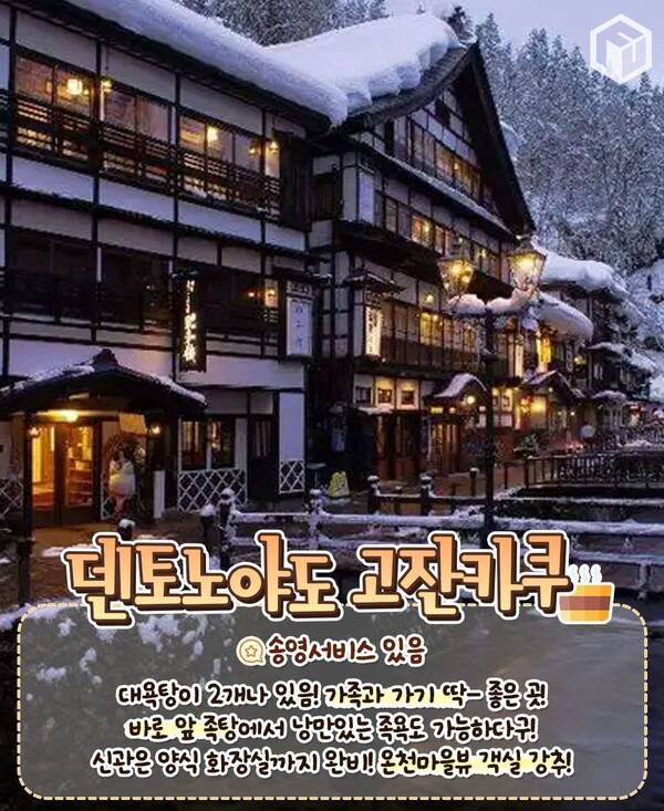 일본 유형문화재로 지정되어 있는 긴잔온천의 대표 료칸 '노토야 료칸'입니다. 100년의 역사를 지닌 료칸 시설로 긴잔온천 내에서도 가장 신비로운 분위기를 풍기는 료칸인데요. 가격이 비싼 것은 물론 예약 경쟁이 치열해 겨울시기에는 약 3~4개월 전에 객실을 예약해야 합니다. 전망 노천탕에서는 시로가네노타키를 조망할 수 있습니다.