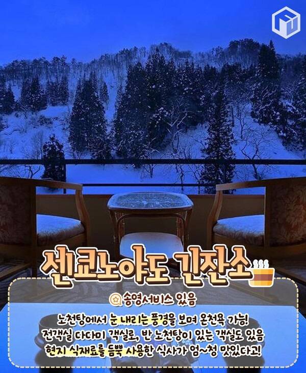 눈 내린 산의 풍경을 파노라마로 조망할 수 있는 센쿄노야도 긴잔소입니다. 전객실이 다다미 객실로 운영되고 있으며, 객실 타입에 따라 객실 내 반 노천탕 시설이 있기도 합니다. 긴잔소 료칸은 긴잔온천 료칸 중에서도 현지 식재료를 활용한 맛있는 조식과 가이세키를 제공하는 것으로 유명합니다.