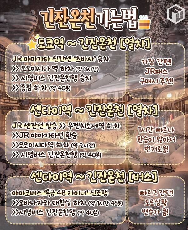 도쿄 JR 패스를 구입했다면 도쿄역에서 야마가타 신칸센을 이용해 방문할 것을 권장하는데요. 신칸센 '츠바사' 탑승시 좌석을 지정해야하므로 사전 예매를 권장합니다. 오오이시다역까지 환승 없이 약 3시간을 이동한 뒤 시영버스 긴잔온천행에 오르면 되며, 총 소요시간은 약 3시간 40분입니다.