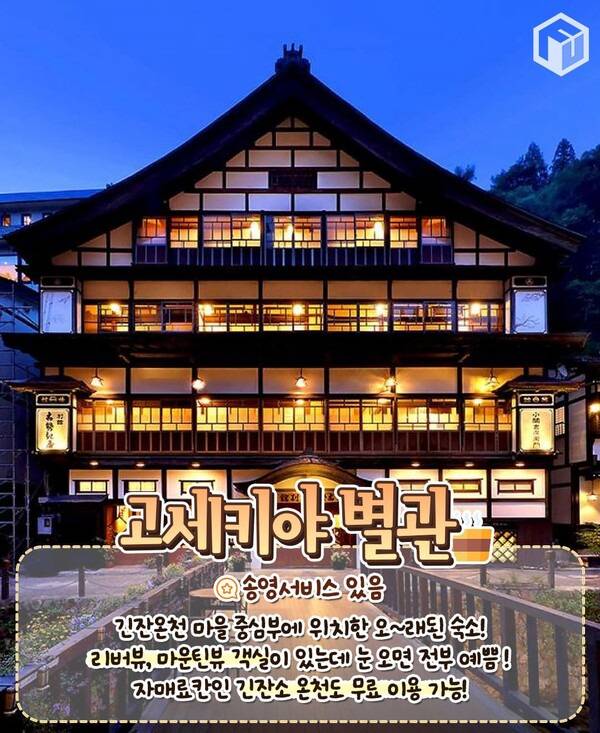 긴잔온천의 중심부에 위치한 오래된 숙소 고세키야 별관입니다. 객실은 강 전망과 산 전망으로 구분되는데요. 눈이 많이 내린 겨울철에는 두 전망 모두 아름다운 풍경을 마주할 수 있습니다. 료칸 내 실내 욕탕은 2곳이 마련되어 있으며 자매료칸인 '긴잔소'의 온천 시설도 무료로 이용할 수 있습니다.