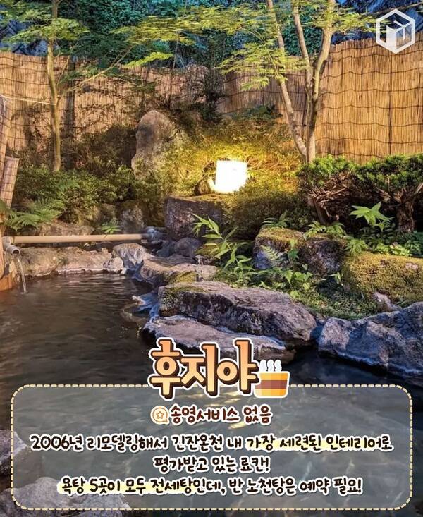 2006년 리모델링으로 긴잔온천에서 가장 현대적이며 세련된 분위기를 자아내고 있는 료칸입니다. 후지야 료칸 내 6곳의 욕탕이 모두 전세탕인데요. 바깥의 풍경을 감상하며 온천욕을 즐길 수 있는 반 노천탕은 예약시 숙소 측으로 예약을 해야 이용할 수 있으니 참고하시길 바랍니다.
