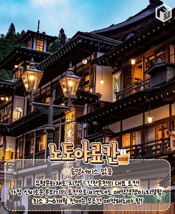 일본 유형문화재로 지정되어 있는 긴잔온천의 대표 료칸 '노토야 료칸'입니다. 100년의 역사를 지닌 료칸 시설로 긴잔온천 내에서도 가장 신비로운 분위기를 풍기는 료칸인데요. 가격이 비싼 것은 물론 예약 경쟁이 치열해 겨울시기에는 약 3~4개월 전에 객실을 예약해야 합니다. 전망 노천탕에서는 시로가네노타키를 조망할 수 있습니다.