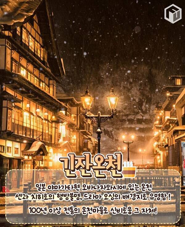 긴잔온천은 일본 야마가타현 오바나자와시에 있는 온천입니다. 우리나라에서는 지브리 애니메이션 '센과 치히로의 행방불명'의 배경과 닮아있는 모습으로 유명한데요. 일본에서는 인기 드라마 오싱의 배경지로 알려지며 관광객은 물론 일본 현지인들 사이에서도 인기있는 온천 마을입니다.