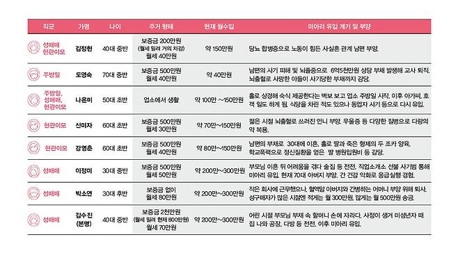 2월9일 아영씨가 일했던 성매매 업소에서 만난 박소연(가명)씨도 한때 작은 디자인 회사의 회사원이었지만, 암 투병 중인 아버지와 간병하는 어머니를 부양하기 위해 부모 몰래 미아리로 왔다(30년 일할 때도 내쫓길 때도…미아리 여성들이 한평생 노출된 빈곤과 착취참조). 성매매 여성이 성구매자 1명에게 성을 판매하고 받는 돈은 5만원인데(총 10만원 가운데 절반), 그는 부모에게 주기적 부양비를 보낼 때 많게는 500만원까지 보내봤다. 100명에게 성매매를 해야 가능한 돈이다.
