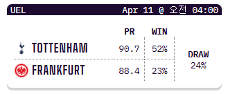 토트넘 이길 확률은? 축구 통계 매체, UEL 8강 1차전 승자로 토트넘 지목했다...“52.3%”