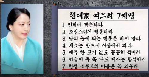 그는 “현대 그룹은 오랜 시간 전해진 가풍으로 유명하다. 오죽하면 ‘현대가 며느리 7 계명’이 있을 정도다.”라고 전했습니다. 노현정의 시할머니 故 변중석 여사가 만들었다는 7 계명은 다음과 같았습니다.