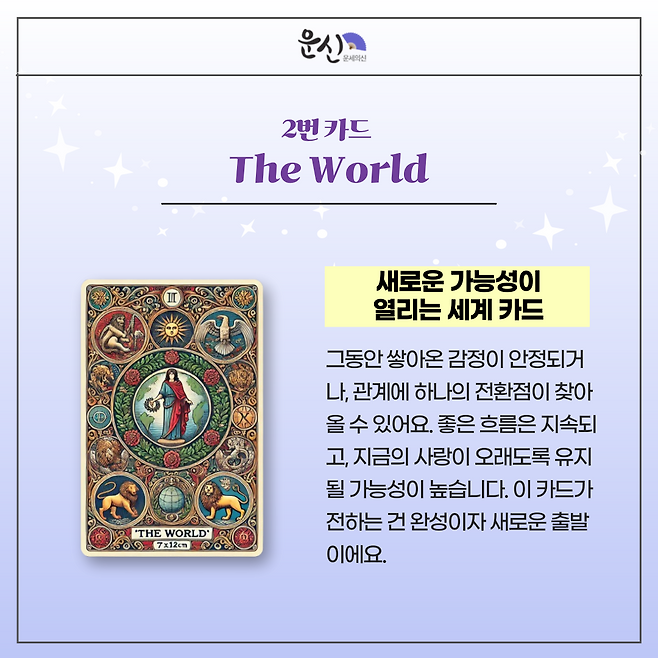 🌍 세계 (The World) 카드는 연애에서 한 주기의 완성과 새로운 시작을 함께 상징합니다.
