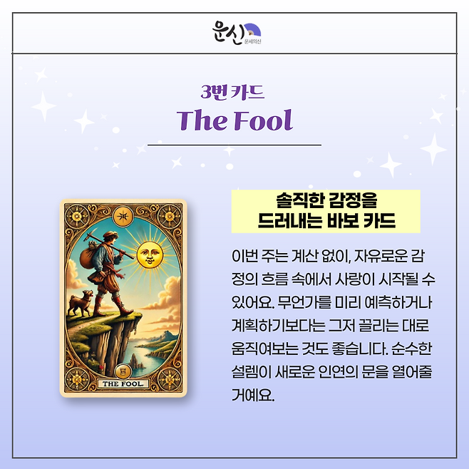 바보 카드는 용기 있는 감정의 시작을 응원하는 카드입니다. 이번 주엔 너무 머리로 재지 말고, 당신의 ‘지금 마음’에 충실해보세요. 사랑은 생각보다 더 단순하고 가벼운 곳에서 시작되기도 하니까요.