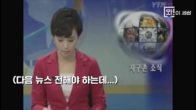 멘트를 이어나갈 수 없어서 고개를 숙이는 아나운서의 모습.
