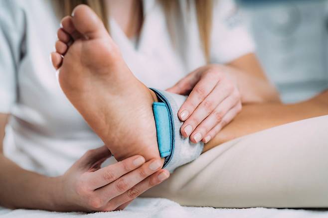 굽이 너무 높거나 밑창이 딱딱한 신발은 발목에 무리를 주니 피하고, 쿠션이 좋고 발목을 잡아주는 운동화를 신는 게 좋아요.