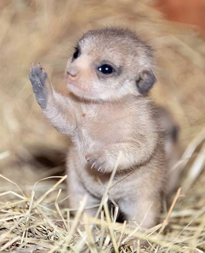 공개된 사진 속에는 두 발로 벌떡 일어서서 조막만한 손을 있는 힘껏 뻗으며 인사하는 아기 미어캣의 귀여운 모습이 담겨 있었는데요.