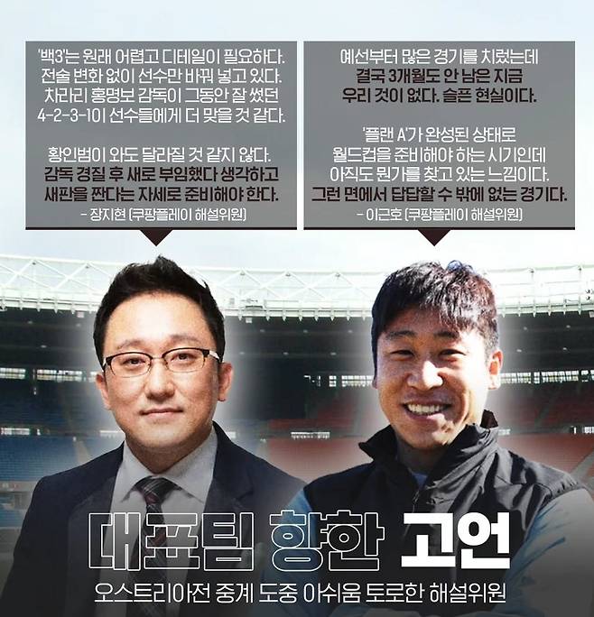 장지현 위원은 쿠팡플레이 중계를 통해 현재 전술이 한국 선수들의 성향과 맞지 않는 '몸에 맞지 않는 옷'이라고 직격 했다. 클럽 팀이라면 사령탑 교체로 국면 전환을 꾀할 만큼 위기라는 그의 비유는, 지금의 전술 기조가 본선 경쟁력을 담보하기 어렵다는 우려를 고스란히 담고 있다.