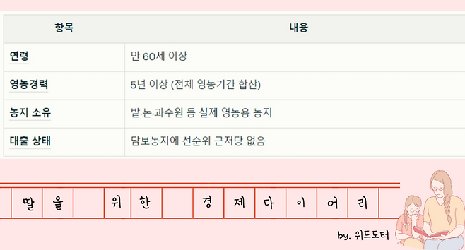 농지연금은 농지를 소유한 고령 농업인이 담보로 노후 생활안정자금을 받는 공적 금융제도예요. 만 60세 이상, 5년 이상 영농경력이 있어야 신청 가능합니다. 저희 아버지는 1957년생이라 이미 67세로 조건을 충족하시고, 엄마는 1960년생이라 64세로 신청 가능하답니다.