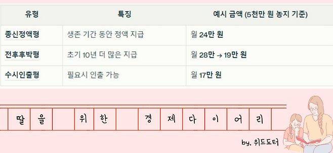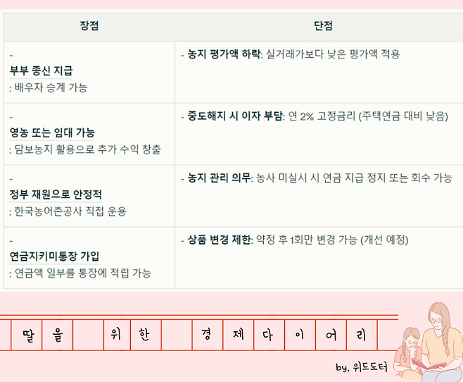 주택연금과 달리 위험부담금이 연 0.5%로 저렴하며, 농지임대로 추가 소득을 얻을 수 있다는 점이 큰 장점이에요.