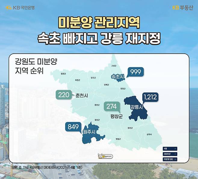이러한 분위기는 미분양 물량 증가에서도 나타나고 있습니다. KB부동산 데이터허브 자료에 따르면, 올해 4월 기준 강원도에서 미분양이 가장 많은 지역 1위는 강릉시로 1,212호가 남아있는 것으로 나타났습니다. 2위는 999호의 속초시입니다.