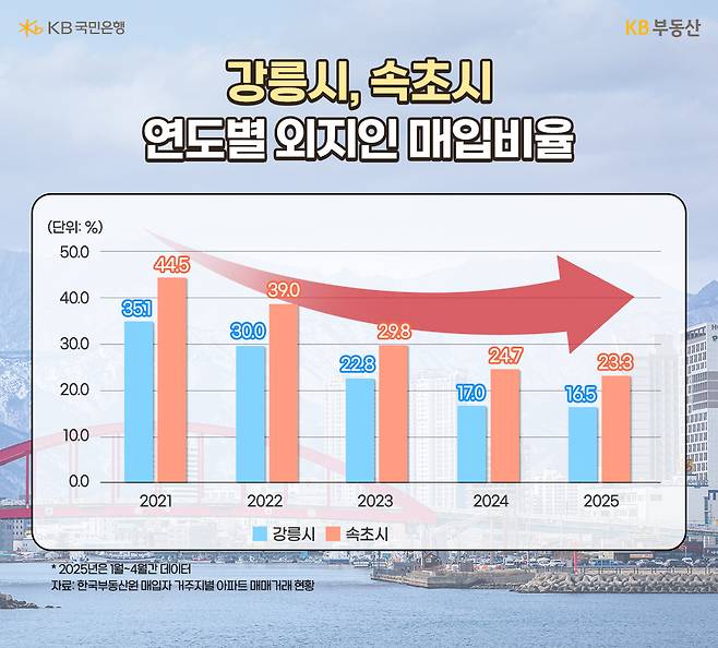 강릉과 속초 아파트를 산 매입자 거주지별 거래 현황을 살펴봤습니다. 한국부동산원 자료에 따르면, 2021년에는 강릉 아파트의 35.1%, 속초는 44.5%가 관할시·도 외 지역 즉, 외지인이 매입한 것으로 나타났는데요. 이후 외지인의 비율이 점차 줄더니 2025년 1월~4월 데이터 기준 강릉은 16.5%, 속초는 23.3%까지 줄어들었습니다.