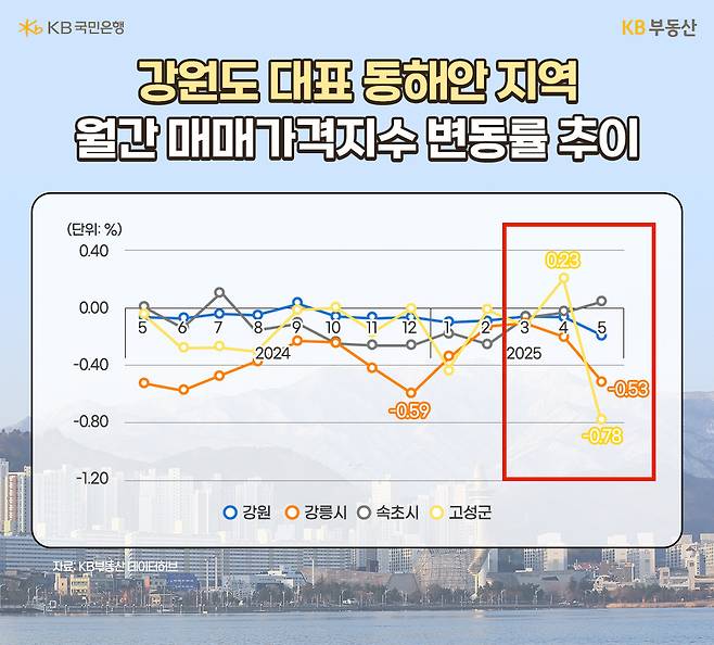 KB부동산 데이터허브 주택가격동향조사 자료에 따르면, 강원도 매매가격지수 증감률은 올들어 -0.50% 하락한 것으로 나타났습니다. 그 중 강릉시는 -1.30%, 고성군 -1.12%, 속초시 -0.46% 등 동해안 지역 집값 하락이 눈에 띕니다.