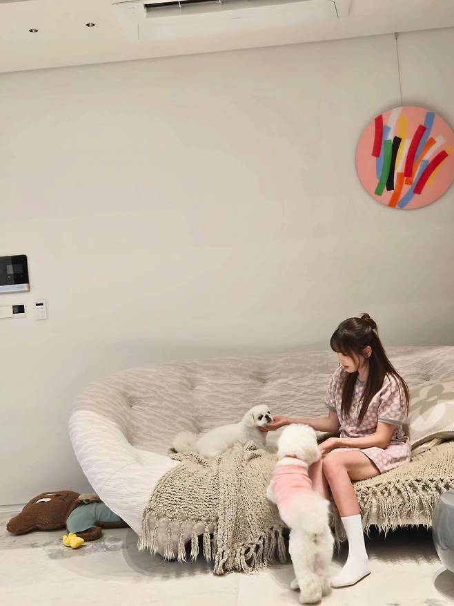 강예원은 반묶음 헤어에 플라워 패턴의 파자마 스타일 원피스를 입고 소파에 앉아 강아지들과 교감하는 순간을 공유했어요.