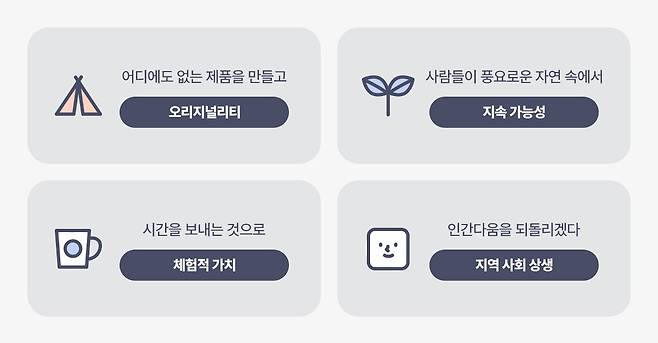 지역 자원을 활용하고 지역 커뮤니티와 협업해 만든 제품은 다른 업체에서 쉽게 따라 하기 힘든 경쟁력을 갖출 수 있었어요. 게다가 해당 지역에 사는 사람이나 일상에서 소식을 접한 사람에게 호감을 살 수 있다는 장점도 있고요. 어려운 지역과 이익을 나누는 브랜드라는 이미지를 만들 수 있는 건 덤이죠!