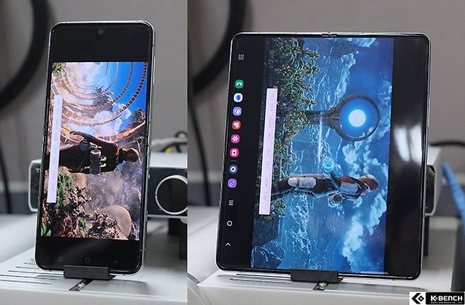 폴드5의 접었을때 결과가 좋지 않은 것은 양쪽으로 분리된 바디 중 한쪽에만 프로세서와 카메라 같은 주요 발열 콤포넌트가 배치되다 보니 접는 상황에서 열을 빠르게 발산시키지 못했기 때문이다.
