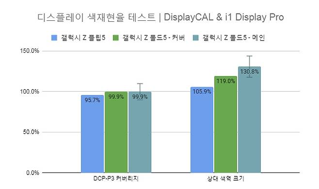 폴드5의 메인 디스플레이는 커버나 플립5 메인 디스플레이와 서브 픽셀 구조가 달랐다. 사실 상 다른 디스플레이라 보면 되는데 그래서 그런지 색재현력이나 전체 볼륨도 더 좋게 측정됐다. DCI-P3 커버리지는 99.9%로 동일하지만 전체 볼륨은 130.8%로 가장 높았다.