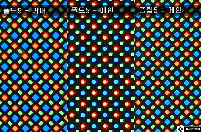 폴드5의 커버 디스플레이의 경우 서브 픽셀 구조가 플립5의 메인 디스플레이와 동일한 걸 보면 같은 패널로 판단되지만 DCI-P3 커버리지는 99.9%를 달성할 만큼 정확도가 좋았다. 전체 볼륨 기준으로도 플립5는 105.9%, 폴드5 커버 디스플레이는 119%라서 색재현력만 놓고 보면 확실히 폴드5 커버 디스플레이가 플립5 메인 보다 좋다고 볼 수 있다.