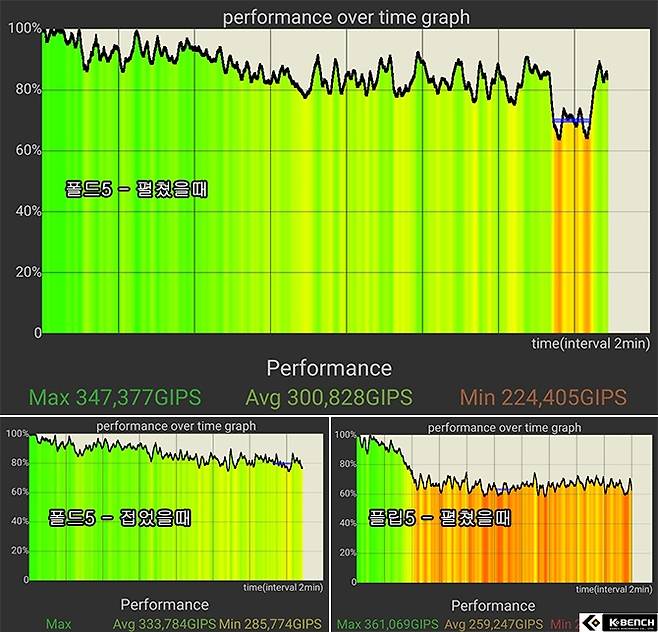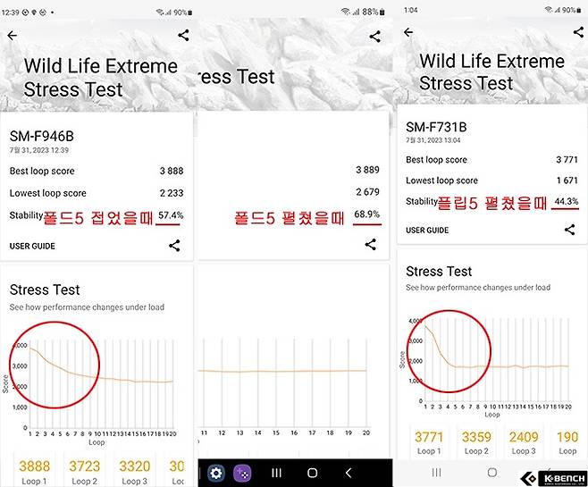 GPU 성능에 좌우되는 3DMARK는 폴드5도 좀 문제가 있었다. 접어서 사용하는 조건에서 결과가 57.4%로 기록된 것이다. 20번의 반복 테스트 중 10회 만에 60% 초반까지 점수가 하락한 걸 보면 접어 쓰는 환경이 쿨링에 얼마나 좋지 않는가를 알 수 있다.