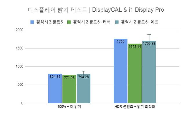 플립5는 이런 조건에도 밝기가 960니트를 넘지 못했다. 만약 삼성이 강조한 1600~1700 니트를 경험하고 싶다면 HDR 콘텐츠를 재생하면 된다. HDR 콘텐츠 재생 시 고휘도 플레시 사용 조건하에 폴드5는 1709니트(커버는 1628니트), 플립5는 1765니트를 확인한 바 있다.