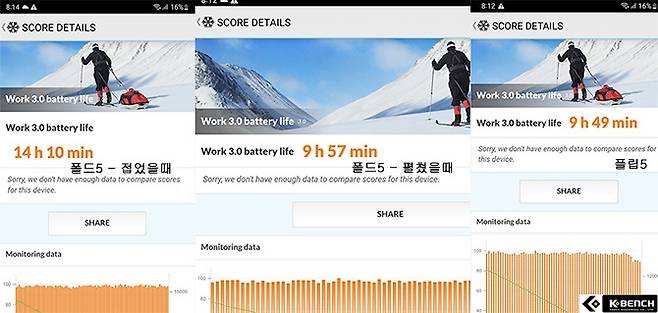 일단, 폴드5의 PCMARK 배터리 테스트 결과는 펼쳤을 때가 9시간 57분, 접었을 때가 14시간 10으로 측정됐다. 이 결과를 UL.COM이 제공한 폴드4 시간과 비교하면 4분이라는 차이가 발생하는데 이 정도면 사실 상 배터리 시간 차이는 없다고 봐도 무방할 것 같다.