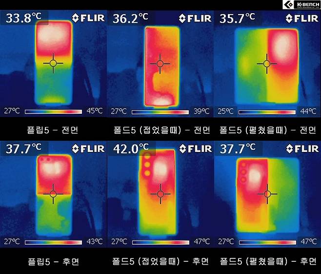 실제, 열화상 카메라로 폴드5의 외부 온도를 확인해 보면 펼쳐서 쓸 때와 접어 쓸 때의 후면 온도는 47도로 동일하지만 전면은 접었을때가 39도로, 펼쳤을때 최고 온도 44도 보다 5도나 낮게 측정됐다.