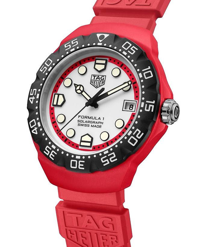 플라스틱으로 만들었던 지난 포뮬러 1의 전통을 따라 이번에도 9개 레퍼런스 중 일부 모델은 합성 소재로 제작됩니다. 태그 호이어는 이번 포뮬러 1을 위해 TH-폴리라이트라는 신소재를 개발했다고 해요. 스테인리스 스틸 케이스로 만든 레퍼런스도 있지만, 다이빙 베젤은 모든 레퍼런스가 TH-폴리라이트 소재로 만들었습니다. 스테인리스 스틸 케이스 레퍼런스 2종과 빨간 TH-폴리라이트 케이스 레퍼런스 1종은 일반 판매 레퍼런스이지만, 그 외 6종은 각각의 F1 그랑프리 일정에 맞춰서 한정 판매될 예정이에요.
