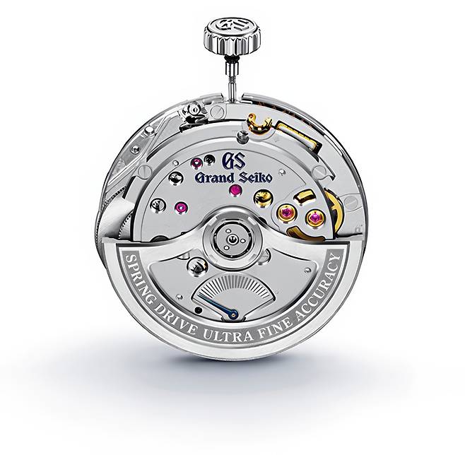 그랜드 세이코의 시계 라인업은 쿼츠와 수동 기계식, 오토매틱 기계식 등 소비자의 기호와 예산에 맞는 다양한 라인업이 있지만, 이중 단연 돋보이는 것은 바로 스프링 드라이브입니다. 세이코가 1999년에 개발한 스프링 드라이브는 일반적인 기계식 무브먼트에서 메인스프링의 에너지를 분산시키는 역할을 전자기로 동작하는 브레이크, 즉 전자식 탈진기가 대신합니다. 이 전자식 탈진기는 감긴 메인스프링의 에너지를 전기 에너지로 바꿔주는 초소형 발전기를 통해 동작해요. 차로 비유하면 휘발유 엔진이 바퀴를 직접 굴리지 않고 단순히 전기 모터를 구동하기 위해 사용되는 일부 하이브리드 차와 비슷한 원리죠. 이런 방식으로 배터리가 필요 없다는 기계식 무브먼트의 장점과 쿼츠에 비견할 만한 오차범위를 모두 가지게 됐어요.