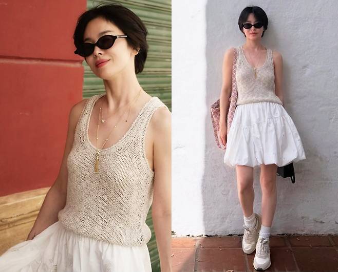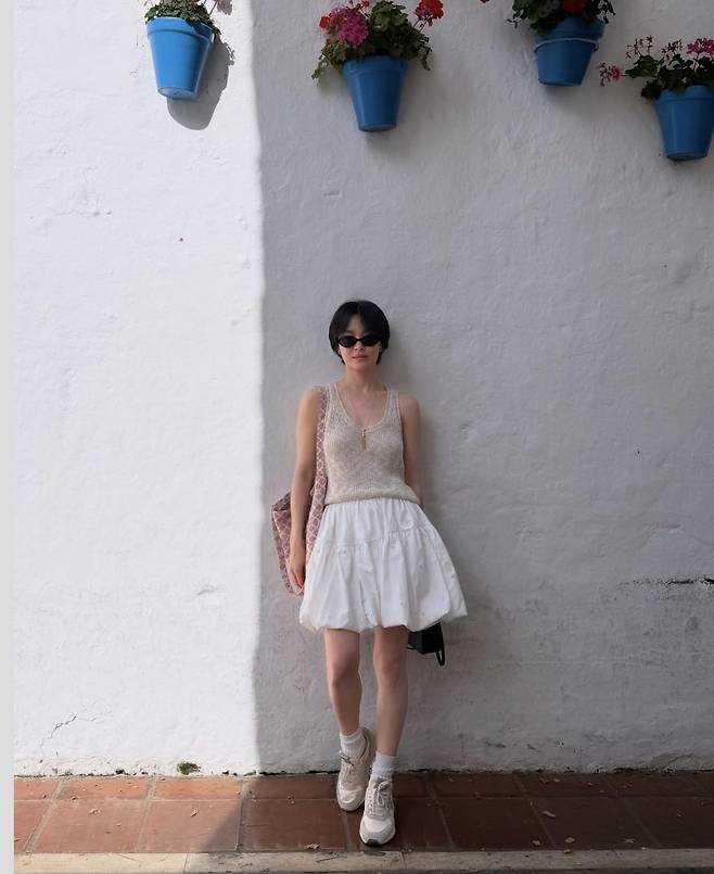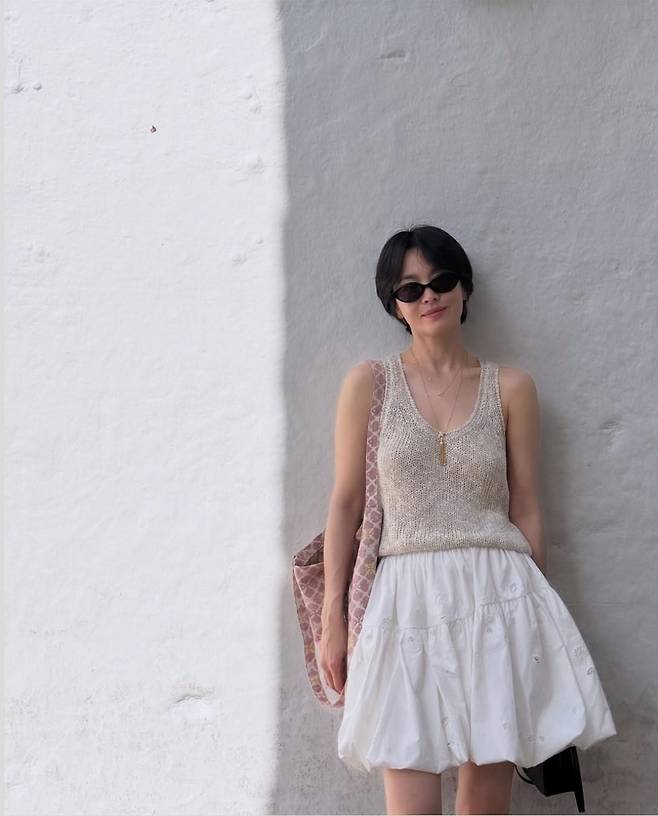 송혜교는 내추럴한 니트 슬리브리스 톱에 하얀 벌룬 미니스커트를 매치해, 바캉스를 연상케 하는 산뜻한 스타일링을 완성했습니다.