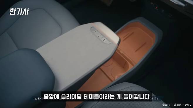 그리고 수납공간이 조금 아쉬운데요. 이게 EV3 차량 같은 경우에 어스 트림 이상부터 중앙에 슬라이딩 테이블이라는 게 들어갑니다. 근데 이게 장단점이 물론 있지만, 사용을 할 때 여기 음식을 올려놓고 먹거나 아니면 물건을 잠시 두고 작업을 하거나 이럴 때는 굉장히 유용하게 사용을 할 수가 있거든요.