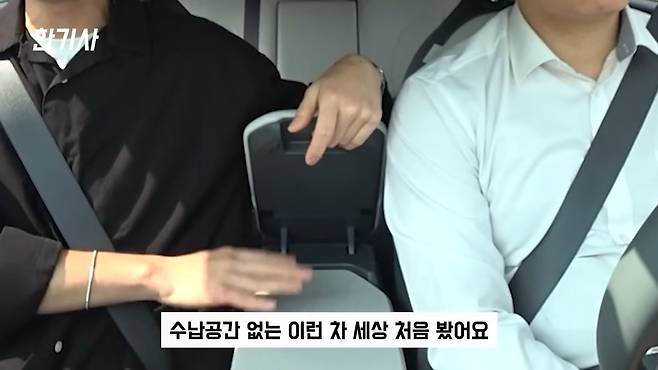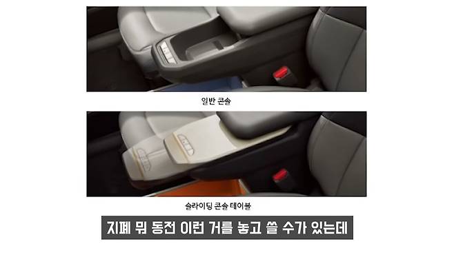그리고 센터패시아 쪽에 있는 팔걸이 쿠션도 대부분은 밑에 수납공간이 있을 거라 생각을 하시는데, 이 테이블이 들어가서 수납공간이 없습니다. 팔만 거치하라고 있는 쿠션입니다.