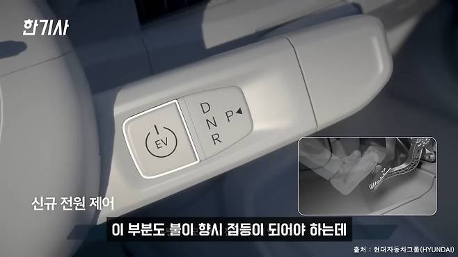그리고 이 칼럼식 기어 옆에 보시면은 EV 시동 버튼이 같이 붙어있습니다. 이 부분도 불이 항시 점등이 되어야 되는데 이게 라이트를 켜거나 미등을 켜도 불이 점등이 되지 않는 결함이 또 있다 하더라고요.