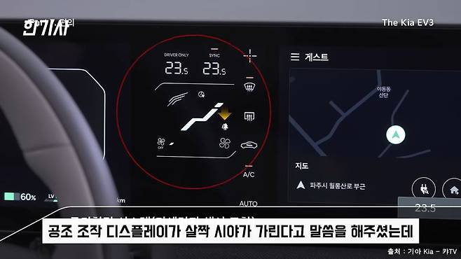 EV9을 타는 차주님께서 계기판과 내비게이션 사이에 있는 5인치 공조 디스플레이가 아주 좋은 기능이긴 하지만 운전석에 앉아 있을 때 핸들이 공조 조작 디스플레이를 살짝 가린다고 하신 적이 있는데, 이 차량도 좀 가려지긴 합니다.