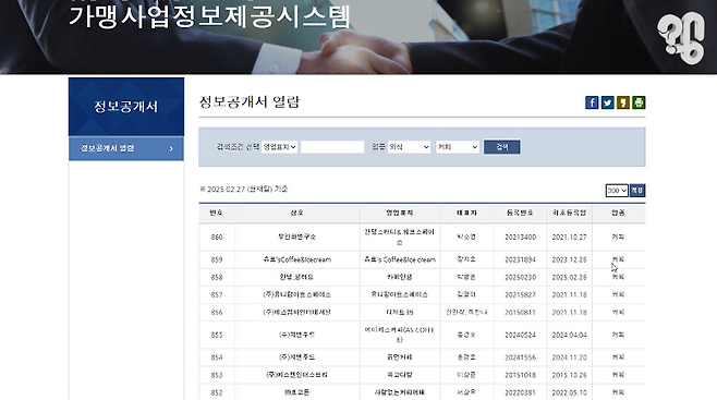 일단 이 자료에 나오는 순위가 맞는지 확인해보기 위해 직접 공정거래위원회에 들어가서, 아메리카노가 2000원 이하인 커피전문점들의 가맹점 수와 매출을 일일이 정리해본 결과가 바로 이 표.
