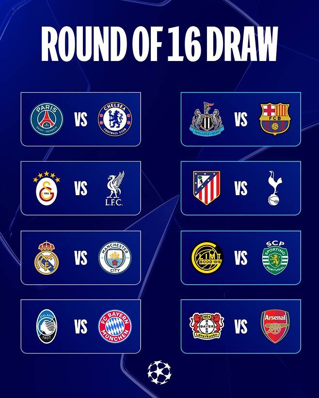 브뤼헤를 꺾은 아틀레티코 마드리드, 올림피아코스를 상대로 승리한 레버쿠젠, 인터밀란을 제압한 보되/글림트, 카라박을 이긴 뉴캐슬 유나이티드, 도르트문트를 누른 아탈란타, AS 모나코를 꺾은 파리 생제르맹, 유벤투스에 승리한 갈라타사라이, 벤피카를 이긴 레알 마드리드가 플레이오프의 승로 16강 무대에 합류했다.