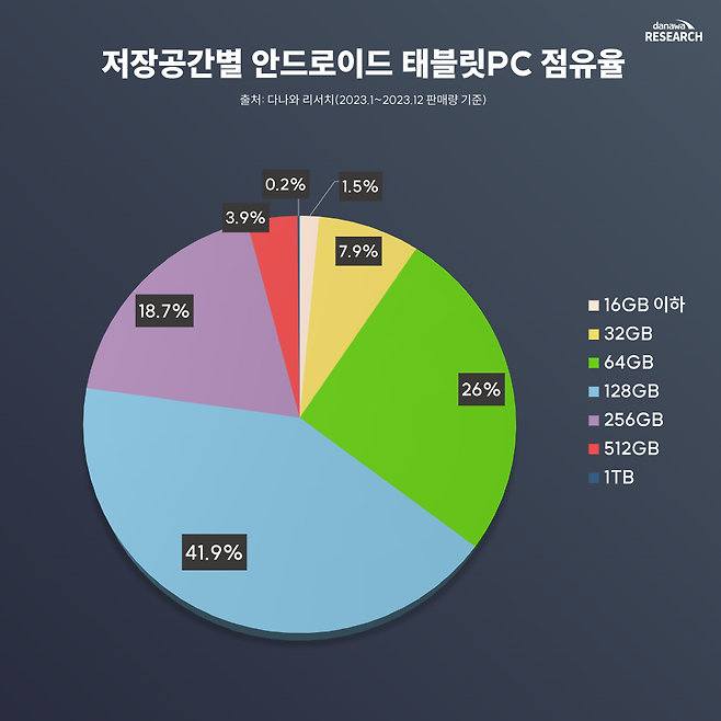 안드로이드 태블릿은 대개 마이크로SD 카드와 같은 외부 스토리지를 지원하기 때문에, 애플 아이패드에 비해 기본 저장공간의 중요성이 상대적으로 낮게 여겨진다. 1위 128GB(41.9%), 2위 64GB(26.0%) 모두 그리 넉넉한 용량이 아니며, 256GB(18.7%), 512GB(3.9%)으로 갈수록 점유율이 하락한다. 16GB 이하(1.5%)처럼 사실상 기본 저장공간을 거의 제공하지 않는 제품들도 존재한다.