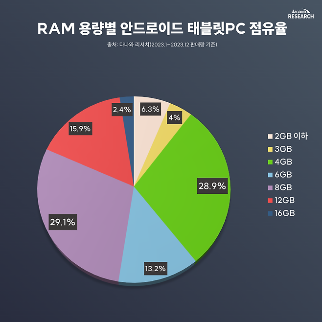 저장 공간보다 중요하게 여겨지는 것은 RAM 용량이다. RAM 용량은 태블릿의 성능과 쾌적함에 큰 영향을 미치기 때문에 크면 클수록 좋다. 점유율이 가장 높은 것은 8GB(29.1%)으로, 중~고급형 태블릿과 게이밍 콘셉트의 태블릿PC 중에서 기본형 제품들이 주로 8GB를 탑재한다.
