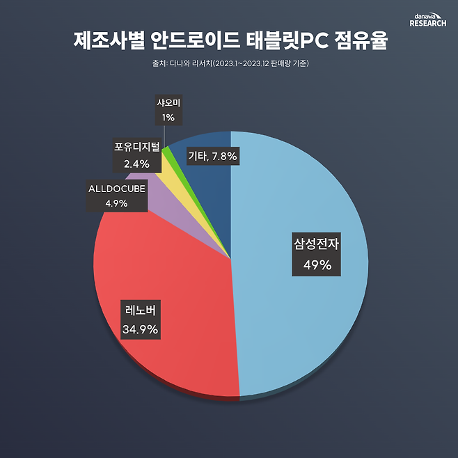 그렇다면 어떤 제조사의 안드로이드 태블릿PC이 가장 인기를 끌었을까? 다나와 리서치를 살펴보면, 지난해 안드로이드 태블릿PC 시장의 맹주는 판매량 점유율 절반(약 49%)을 차지한 삼성전자였다.