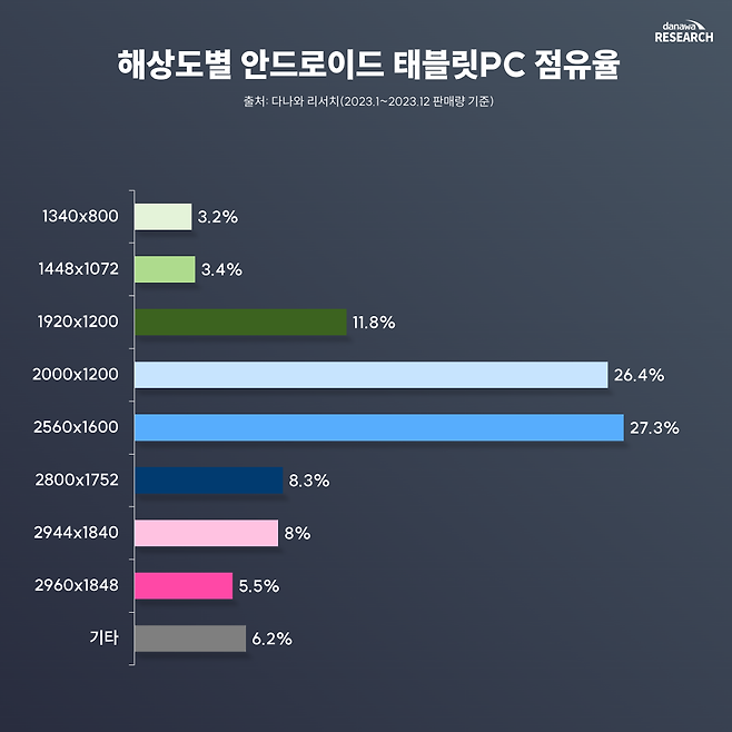 3위는 1920x1200(11.8%), 4위는 삼성전자 갤럭시탭S8/S9에 적용된 2800x1752(8.3%), 5위 샤오미 샤오신 패드에 적용된 2944x1840(8%), 6위 삼성전자 갤럭시탭S8/S9 울트라에 적용된 2960x1848(5.5%) 순이다.