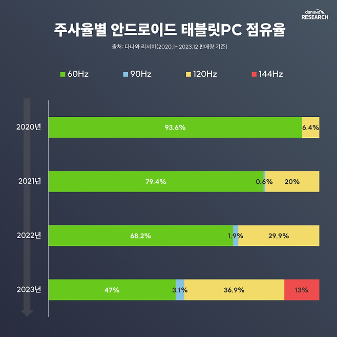 단일 주사율 순위로는 여전히 60Hz가 1위지만, 과반을 잃었다는 것에 주목해야 한다. 60Hz를 제외한 나머지 90~144Hz를 합치면 53%로, 앞으로 태블릿PC 시장은 고주사율이 대세라고 해도 무방하겠다. 세부적으로는 1위 60Hz(47%), 2위 120Hz(36.9%), 3위 144Hz(13.0%), 4위 90Hz(3.1%) 순이다. 2024년 1월 출시하는 삼성전자 갤럭시탭S9 FE가 FE 모델 최초로 90Hz를 지원하기 때문에 향후 90Hz의 점유율이 더 상승할 것으로 전망된다.